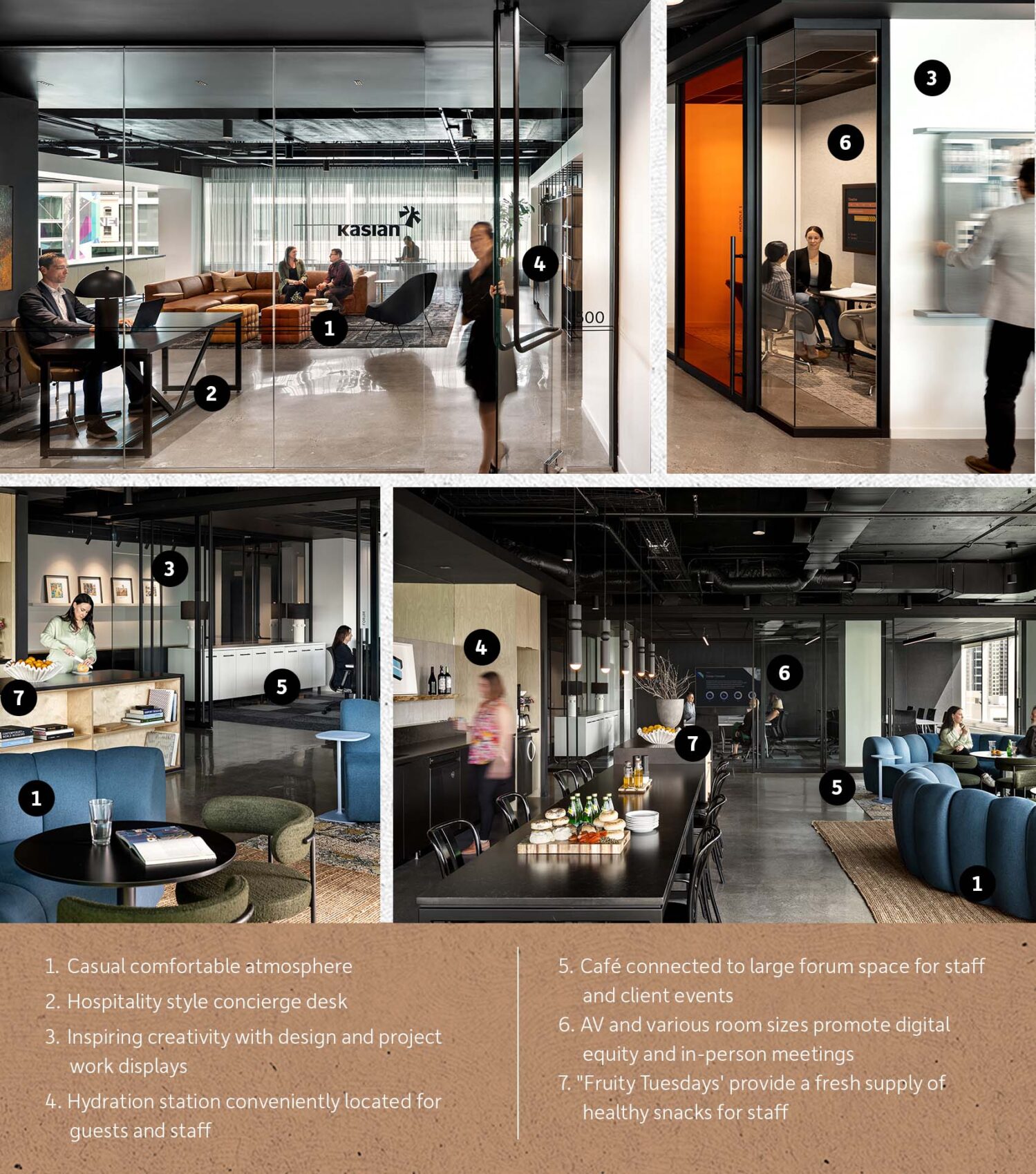 ● The traditional formal reception desk has been replaced by a hospitality-style table in a living room like “welcome zone” with our concierge nearby to assist visitors and staff alike, or they can use the virtual check-in on an iPad at the door.