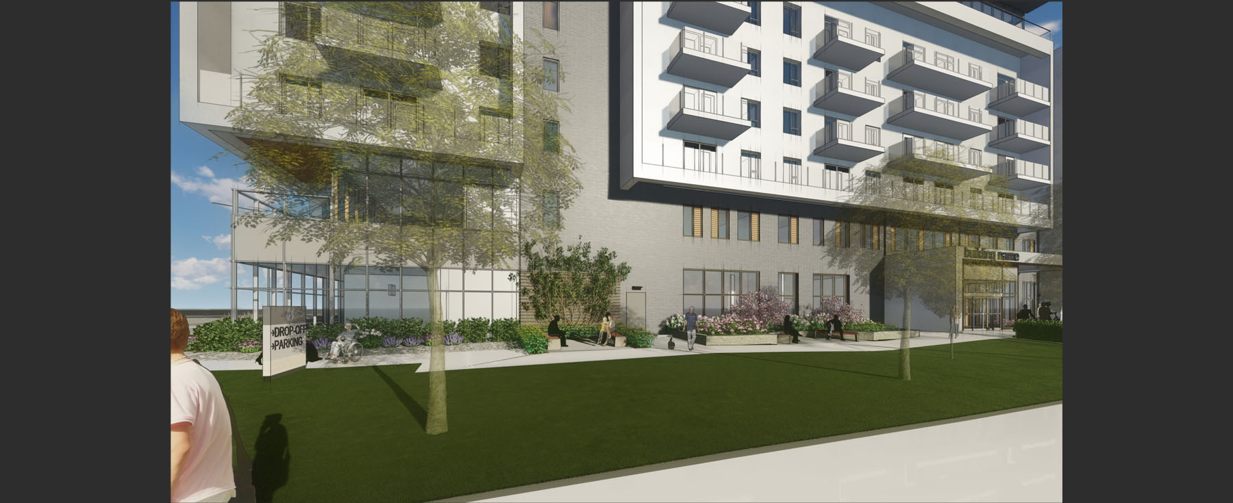The design maximizes its prominent site with an exterior plaza, conversation nooks, and a dog run. A wellness space, including an exam room for visiting specialists, allows residents to access medical and therapeutic care within the community. Other amenities include multiple dining options, fitness, games, crafts, and a salon located at street level with views to the exterior and pedestrian realm.