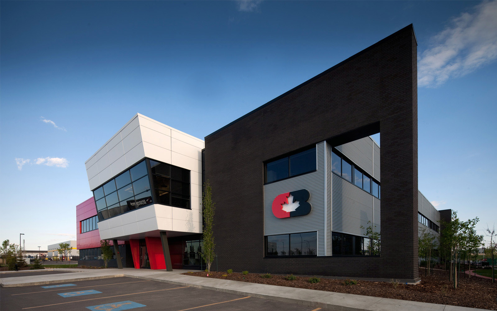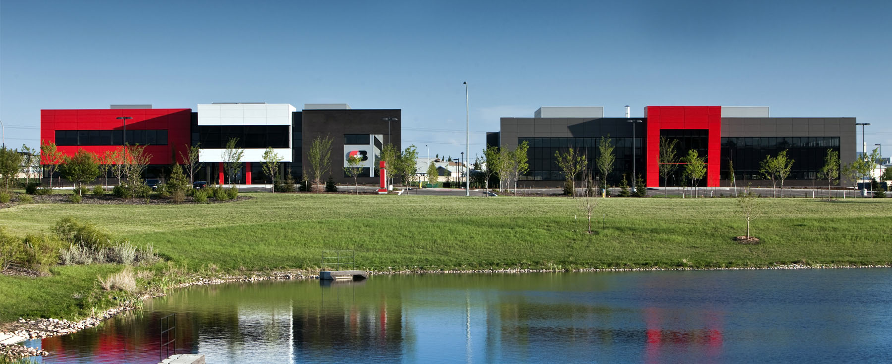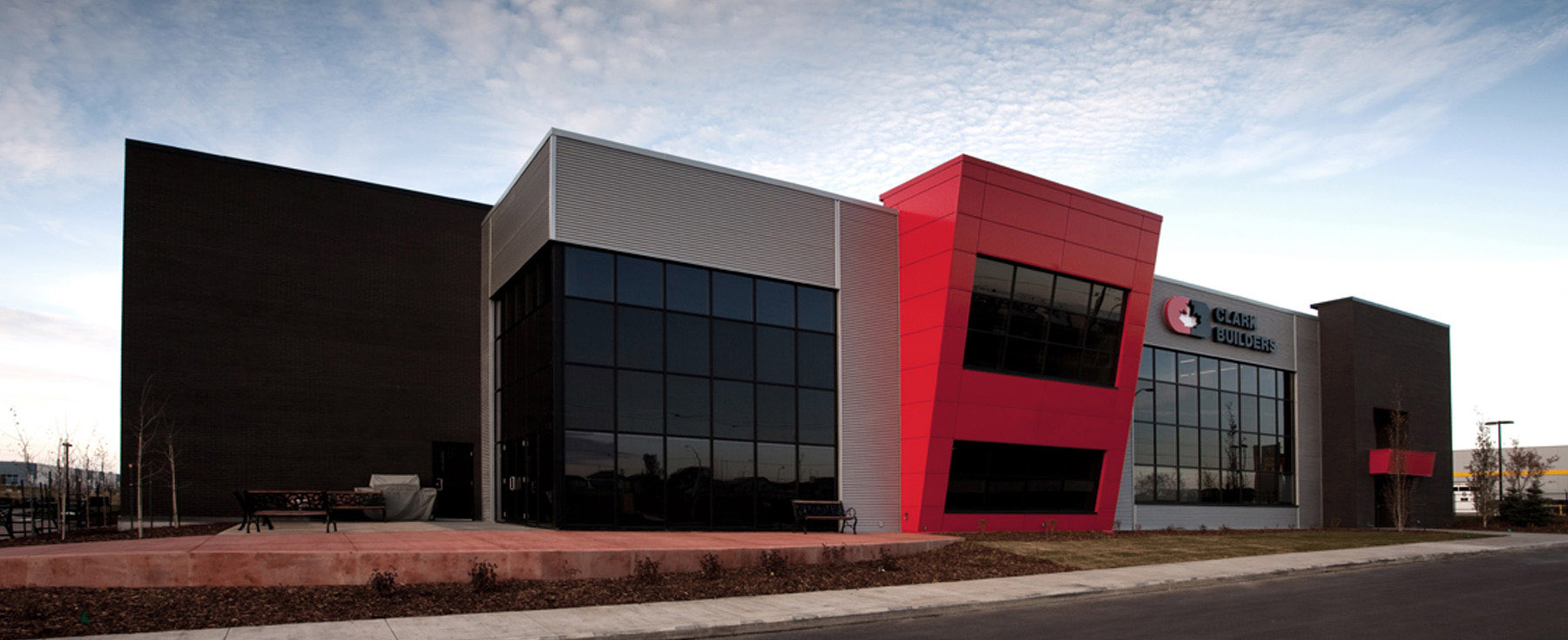 Clark Builders Office Building was designed as the anchor tenant for the Great West Life Business Park in south Edmonton. The two-storey, modular building accommodates the entire administrative and operations team for one of Edmonton’s major contractors. A key design element is the two storey ‘street’ running the entire length of the building which facilitates social interaction among staff and creates a sense of community. Along the exterior, metal sidings and black, red, and silver panels convey a clean, crisp, contemporary image that fittingly represents the unique brand and identity of Clark Builders. In addition to the Clark-occupied building, we also completed another multi-tenant building on the site as part of the overall development strategy.