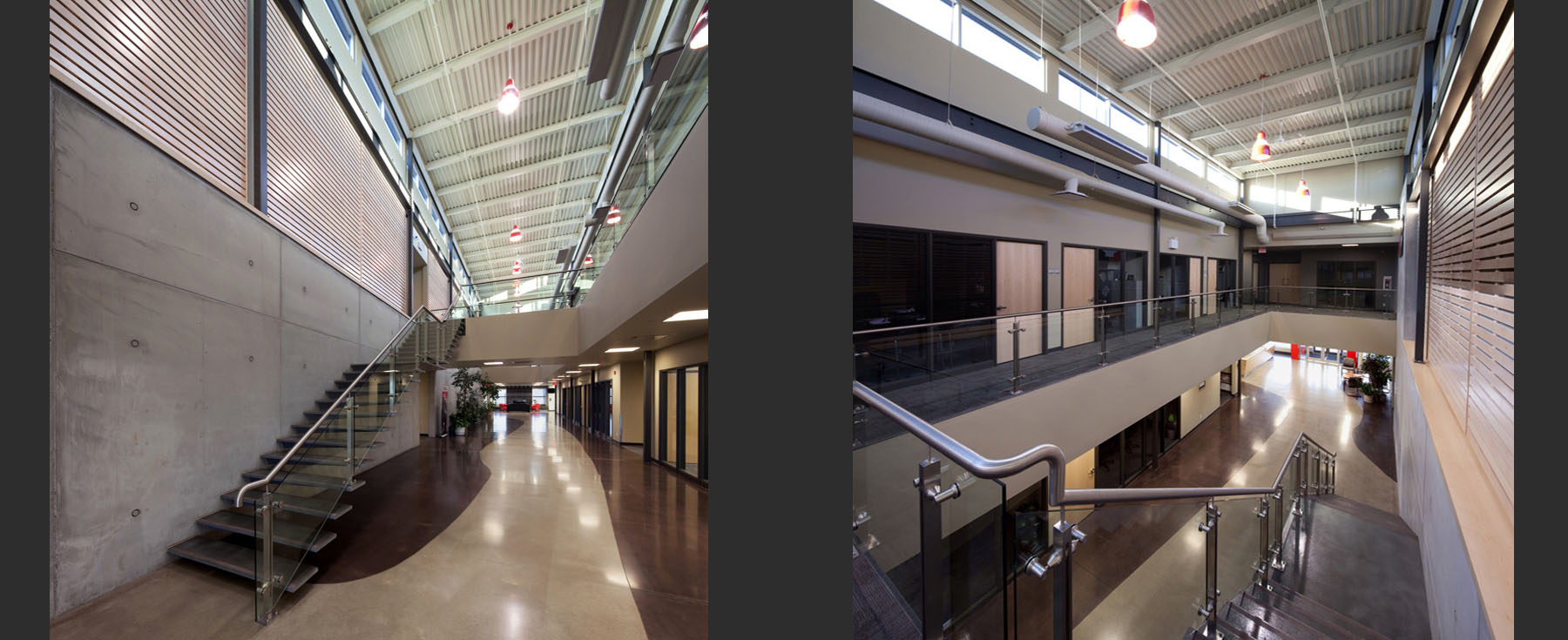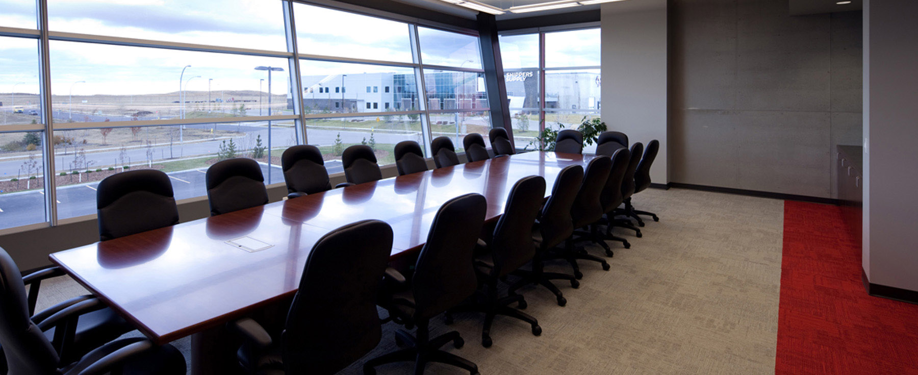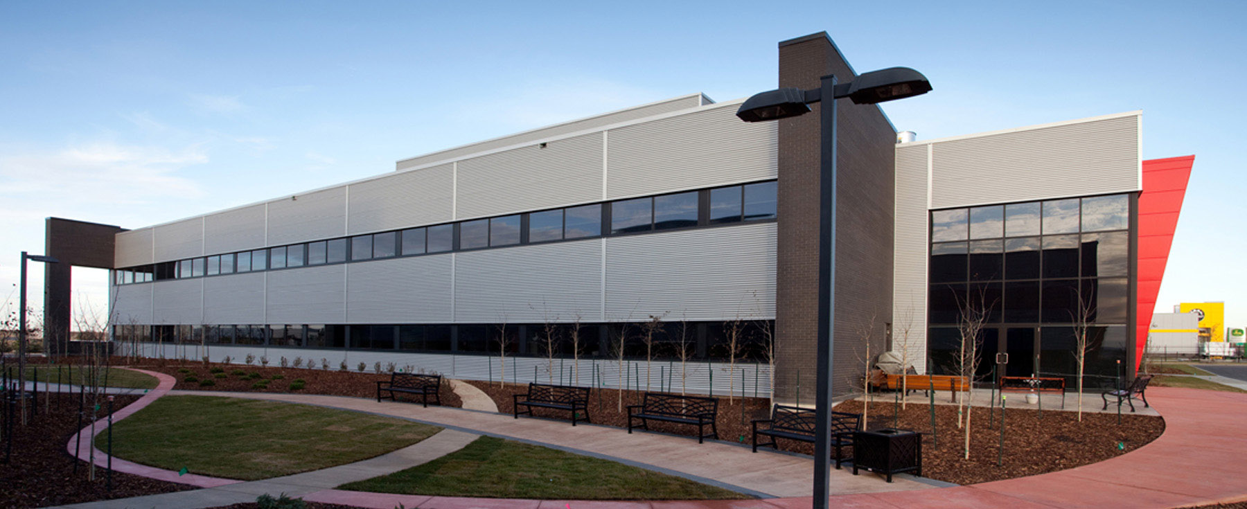 Clark Builders Office Building was designed as the anchor tenant for the Great West Life Business Park in south Edmonton. The two-storey, modular building accommodates the entire administrative and operations team for one of Edmonton’s major contractors. A key design element is the two storey ‘street’ running the entire length of the building which facilitates social interaction among staff and creates a sense of community. Along the exterior, metal sidings and black, red, and silver panels convey a clean, crisp, contemporary image that fittingly represents the unique brand and identity of Clark Builders. In addition to the Clark-occupied building, we also completed another multi-tenant building on the site as part of the overall development strategy.