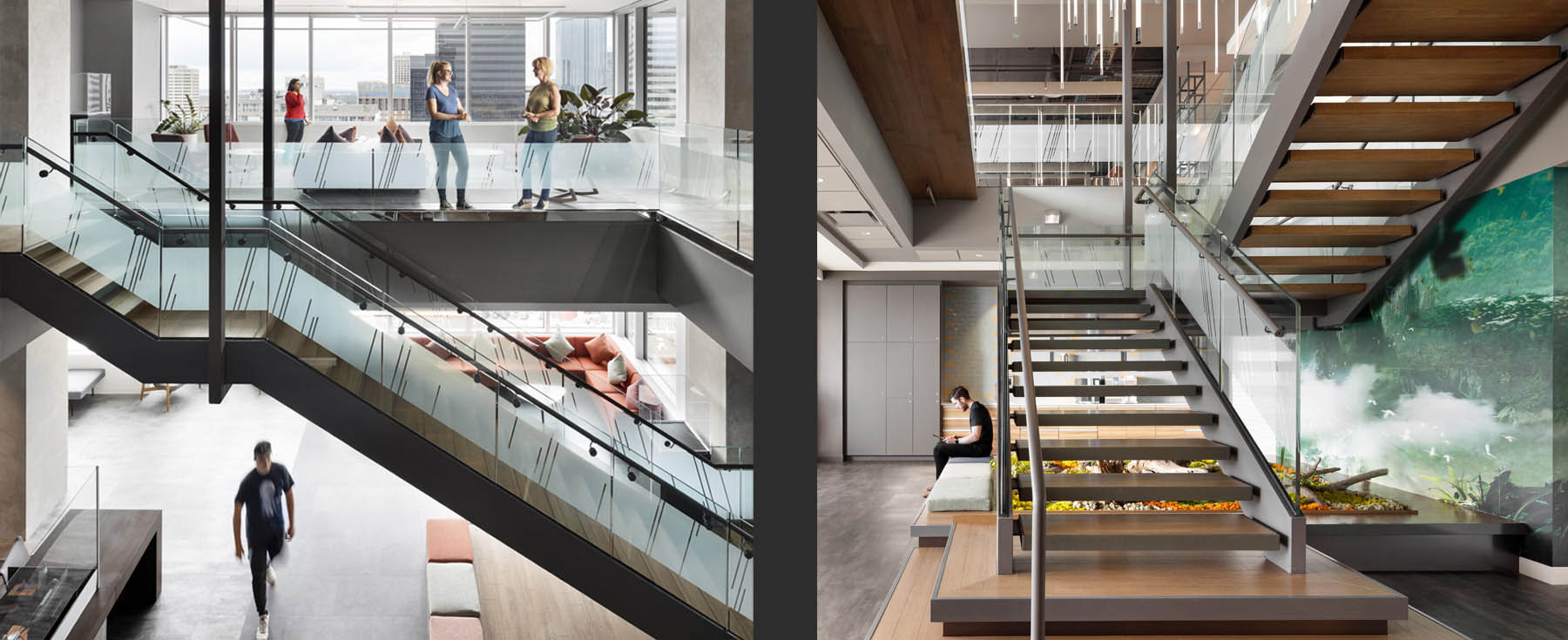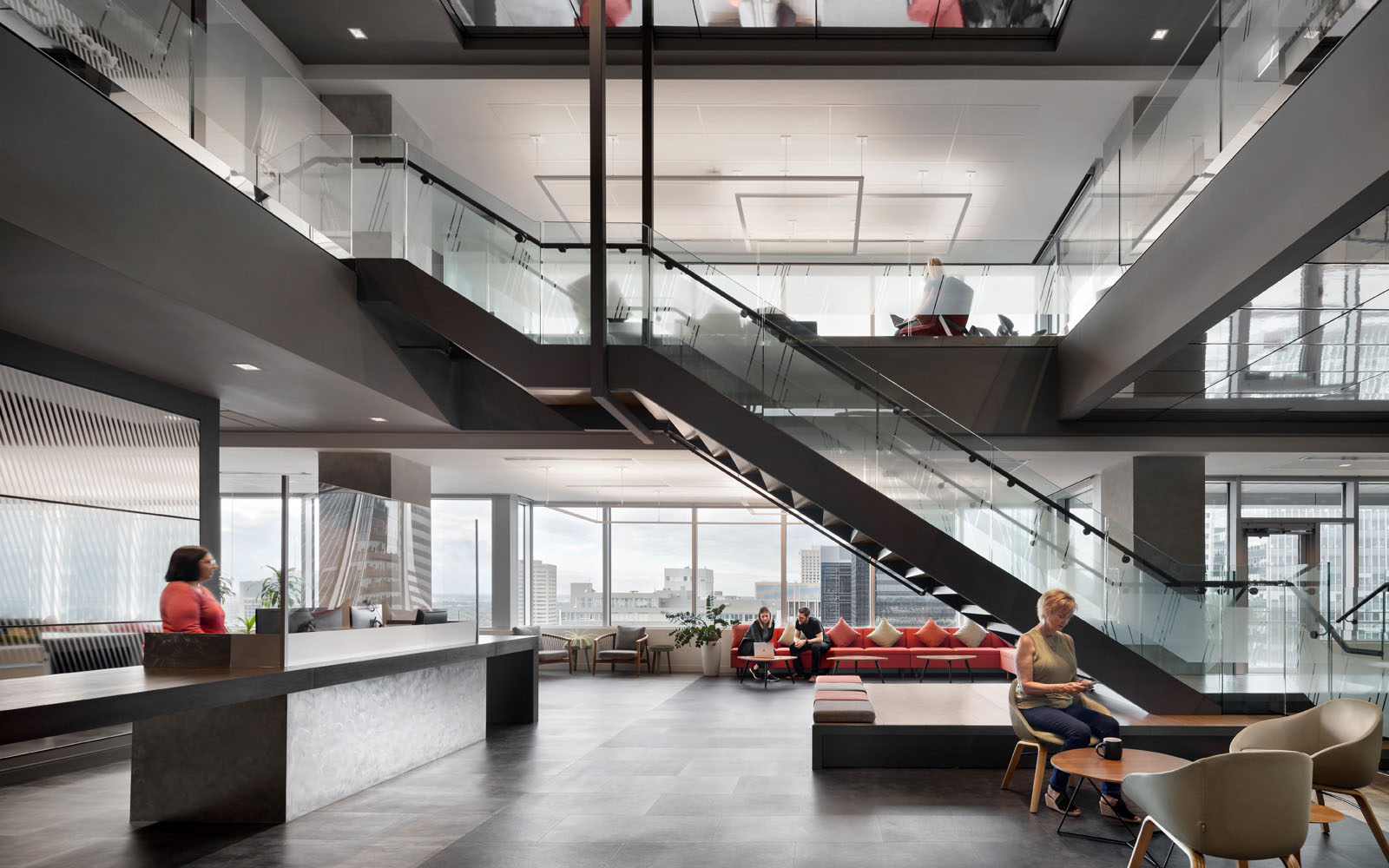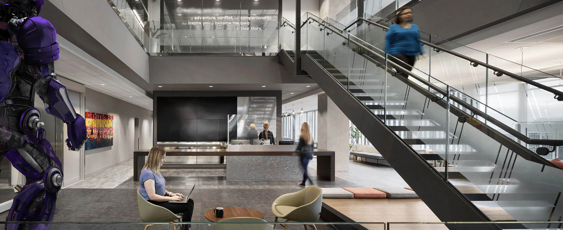 Designed as a destination workplace, the multi-level space for a leading global video game developer inspires staff, enhances creative production, and attracts world-class talent.