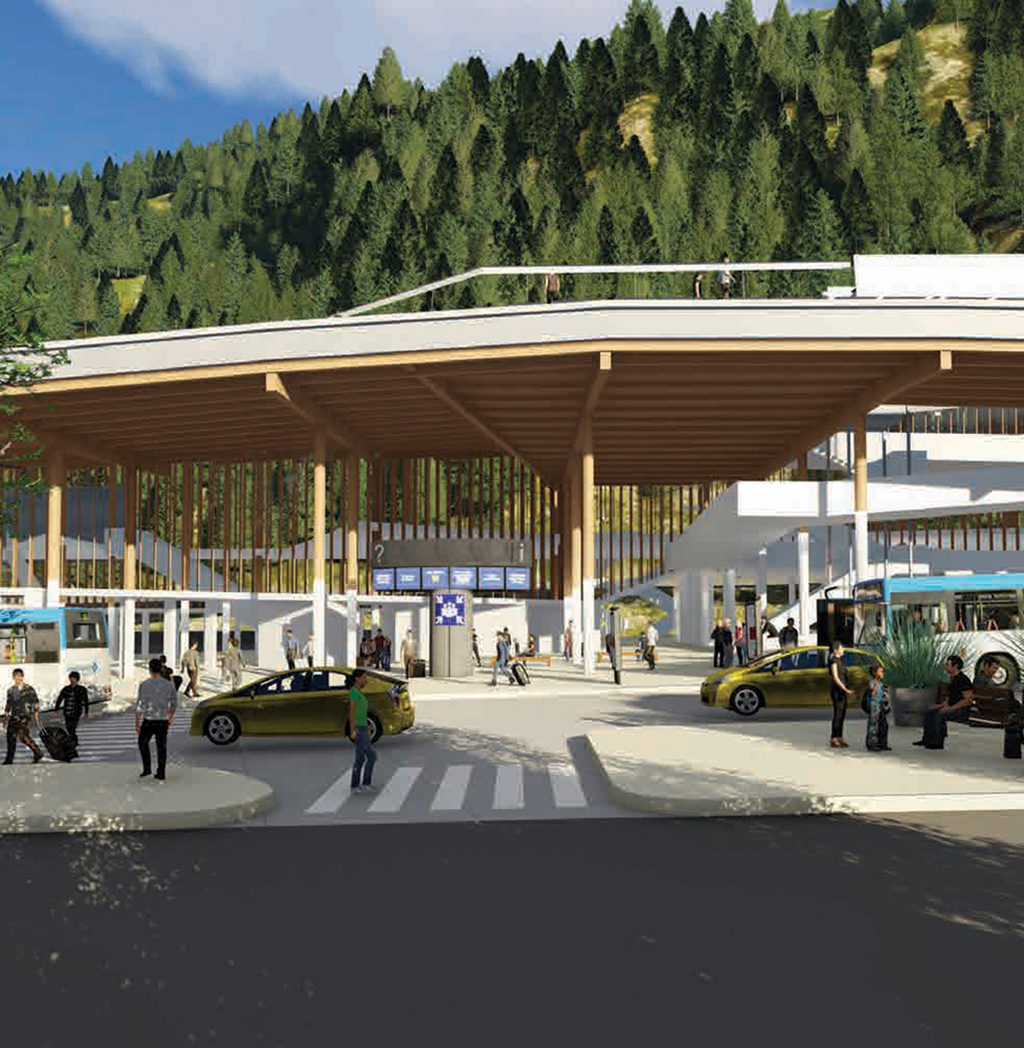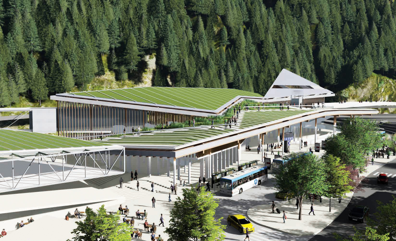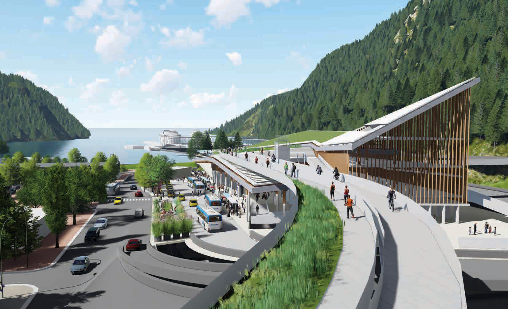 The design incorporates green roofs, accessibility for bikes and pedestrians, and is perceived as an extension of the west coast mountain topography. Vehicle compounds are screened from the village, and a raised walkway for pedestrians and ramps for cyclists provide easy access as well as engaging the West Coast Trail. The design blends the existing waterfront park edge with the retail and restaurants serving the terminal resulting in a cohesive and seamless transition to the village.