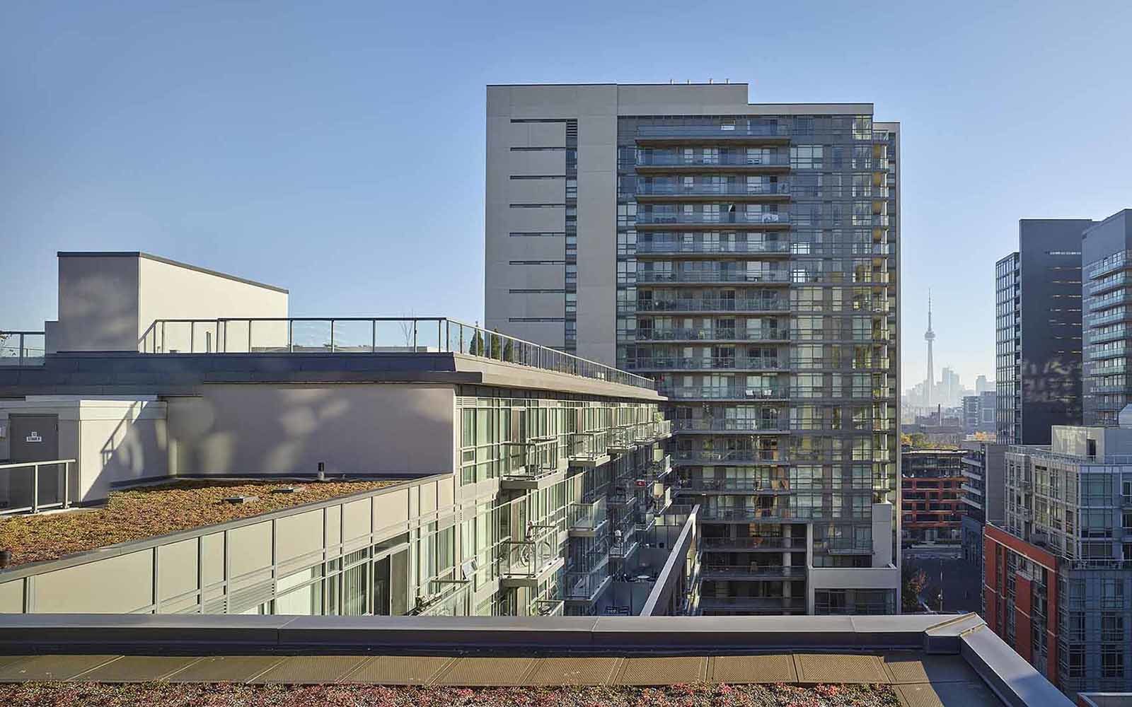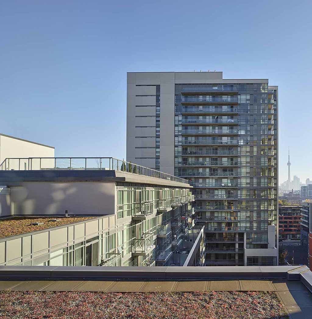 The building follows the Toronto Green Standard and incorporates various sustainable design elements including a green roof, energy efficient envelope, and abundant bicycle storage.