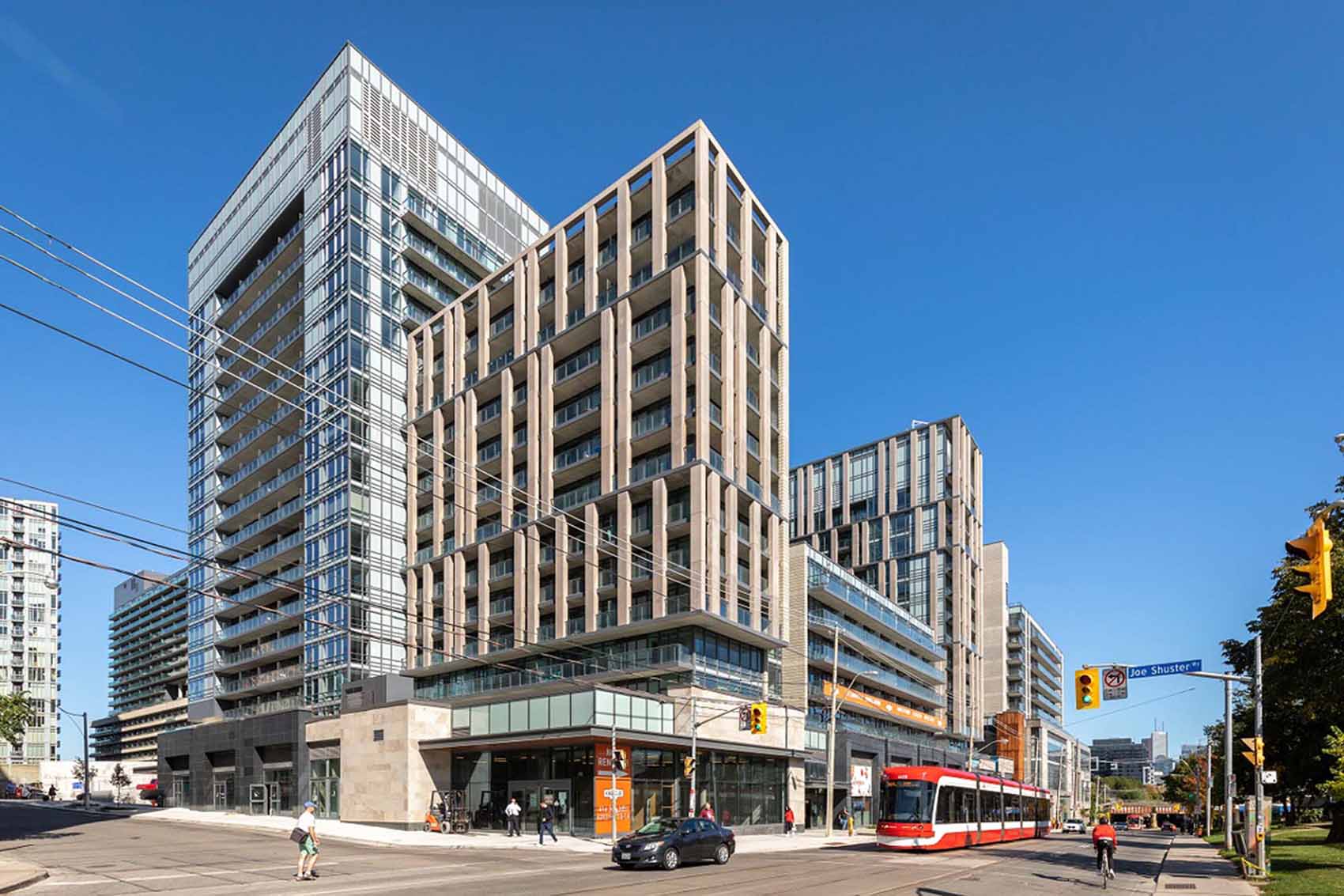 Phase 2 of First Capital Realty’s King Liberty Rail land development was planned as a true mixed-use luxury design project. Incorporating over 200,000 square feet of retail with 506 rental units, office space, and a daycare, the project capitalizes on the synergies between differing uses in Toronto’s Liberty Village neighbourhood. Having successfully completed previous mixed-use developments with the same client – including the neighbouring Phase 1, Fuzion Condominiums – we were selected to continue as the Architect of Record for the residential scope and Design Architect for the retail. The goal was to ensure the right flow between retail and residential while seamlessly integrating the building with its surroundings, creating a neighbourhood of its own and sense of place.
