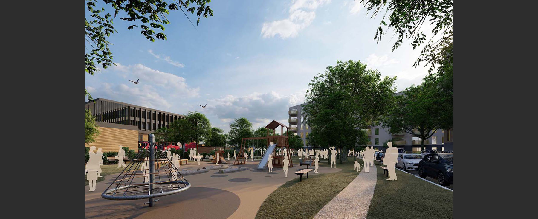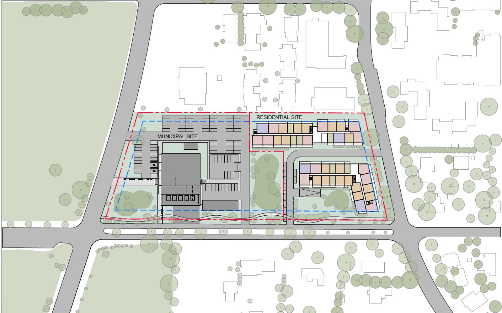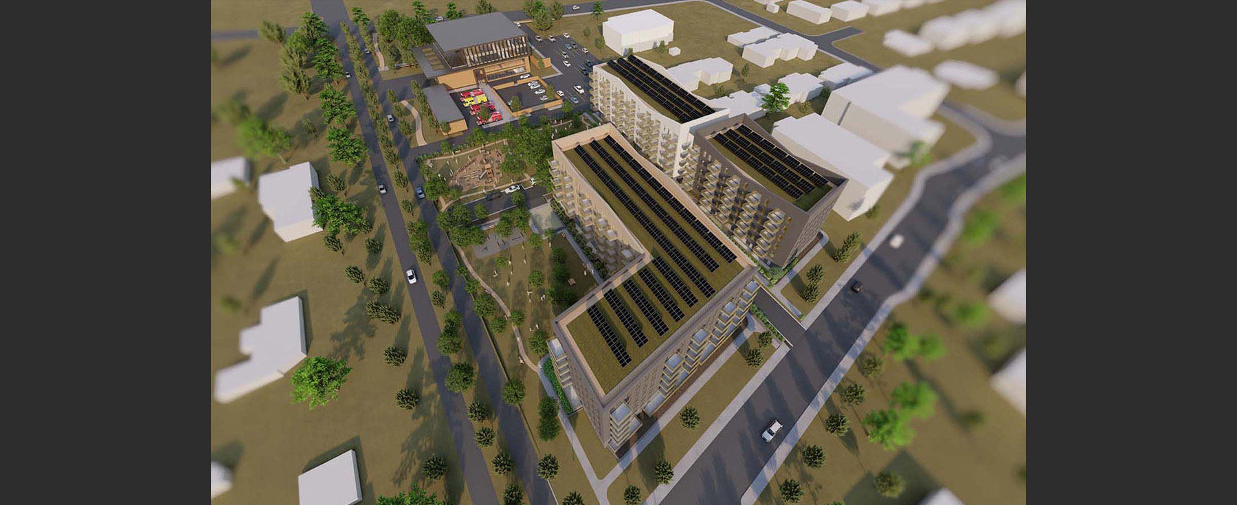 This growing District is looking for the opportunity to replace aging Municipal Facilities while supporting their Official Community Plan vision to increase housing stock, in particular affordable housing. We worked with the District to assess multiple sites and select the ideal location for a new development. The new concept proposes a Community Service Hub on the west side of the site with a combined Municipal Hall, Police Station and Satellite Fire Hall building across from an existing public park. The east side of the site is a proposed new affordable housing community, with outdoor green space and links to an adjacent affordable housing complex and seniors community to the north and east.