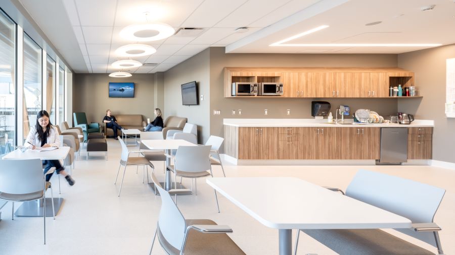 The expansion also led to efficiency improvements in the hospital’s delivery capability while humanizing the patient, staff, and visitor experience. For example, the expanded emergency department doubled the number of treatment spaces and features an area dedicated to children and families. The MDRD was expanded and relocated closer to the new operating rooms and surgical suites to create direct links and an optimum flow of resources and staff within the hospital. The interior design offers comfort for patients, as well as friends and family members, for both short visits and prolonged stays.
