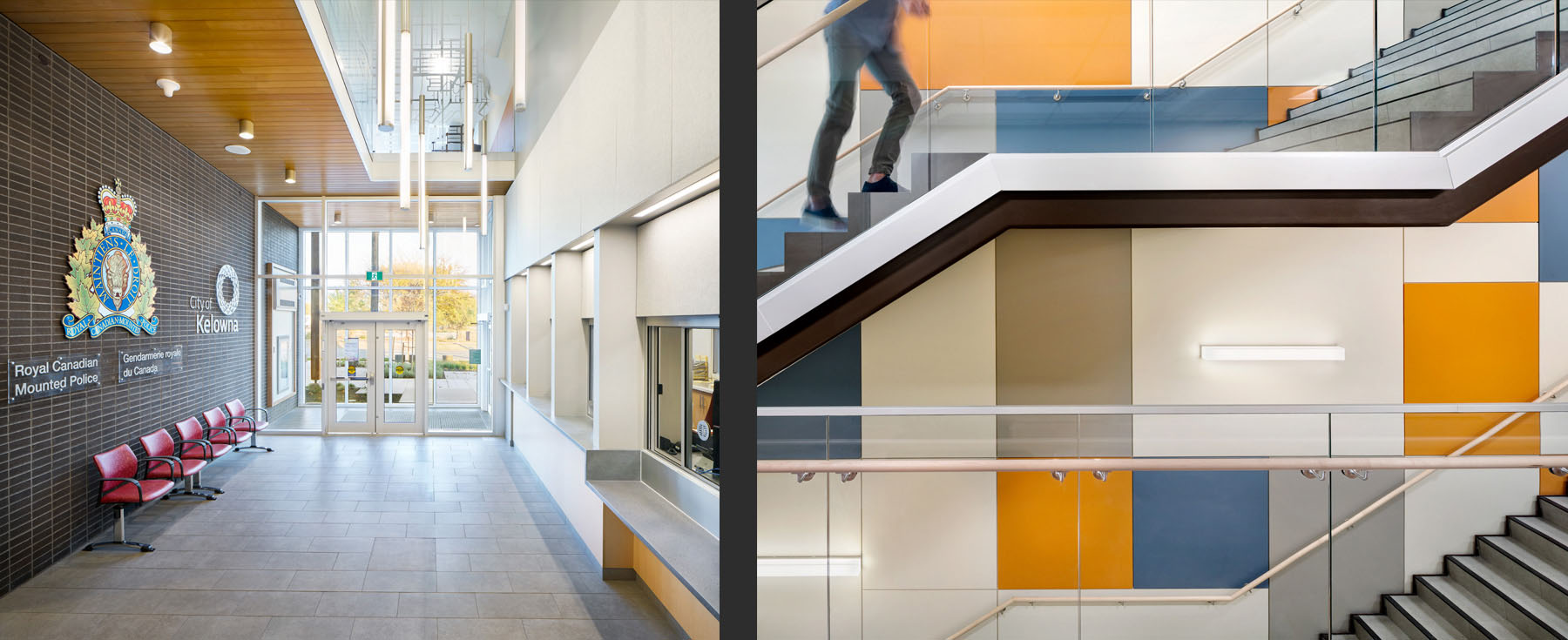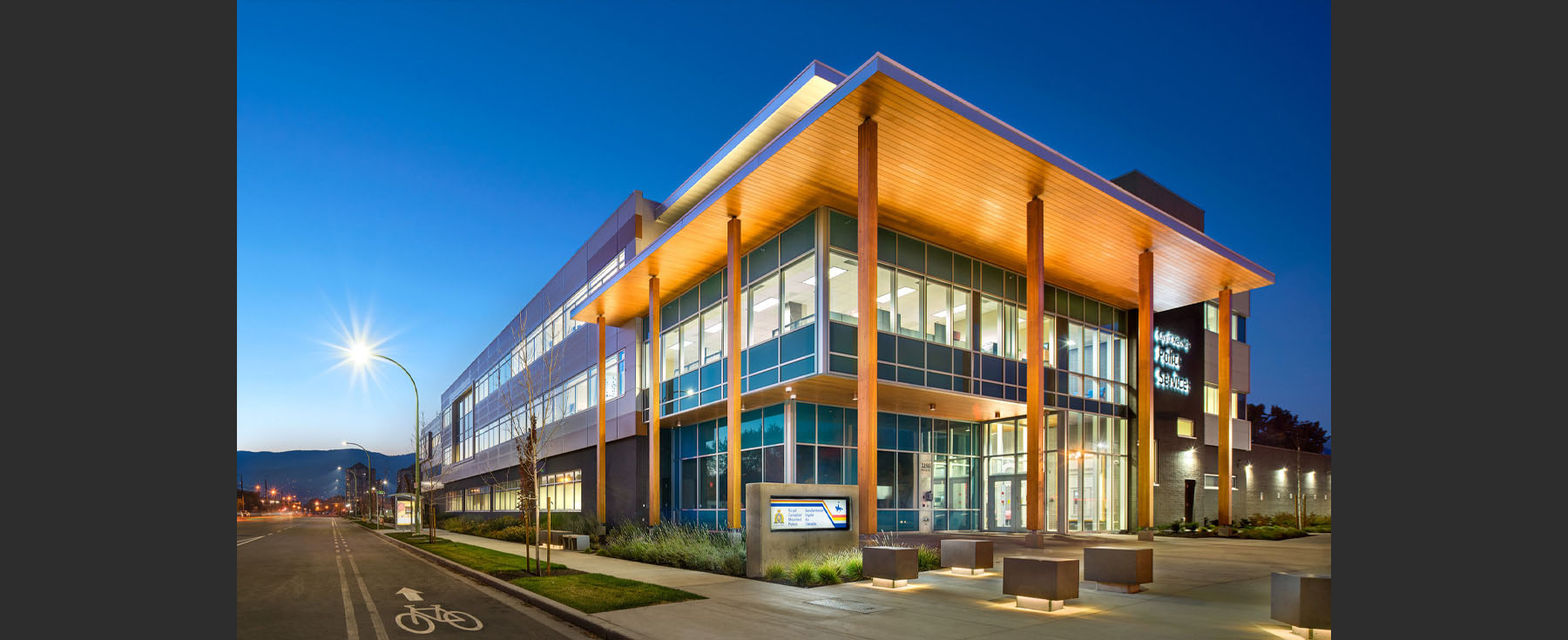 As part of a design-build team, we developed this state-of-the-art RCMP headquarters to support the growing Kelowna community. The design aesthetic balances the highly secure nature of a police facility with elements that reflect the vibrant lakeside community. The form of the building has been shaped to fit the evolving urban fabric of Kelowna’s downtown. Thoughtful placement of windows frame views of the surrounding Okanagan landscape and introduce natural light without compromising security. The colour palette of the building is drawn from that surrounding landscape, using materials such as wood and stone which are durable and timeless.