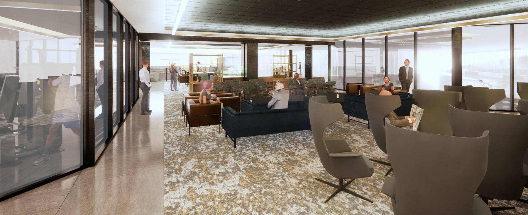 On the second floor will be a tenant lounge which includes a fish tank, a fireplace, a podcast room, and a golf simulator. An adjacent conference centre with several meeting rooms is accessible directly from the lounge. The gym area, previously located on the concourse level, has been relocated to the second level with new equipment and lifestyle graphics to animate the space which has an abundance of windows to the exterior.