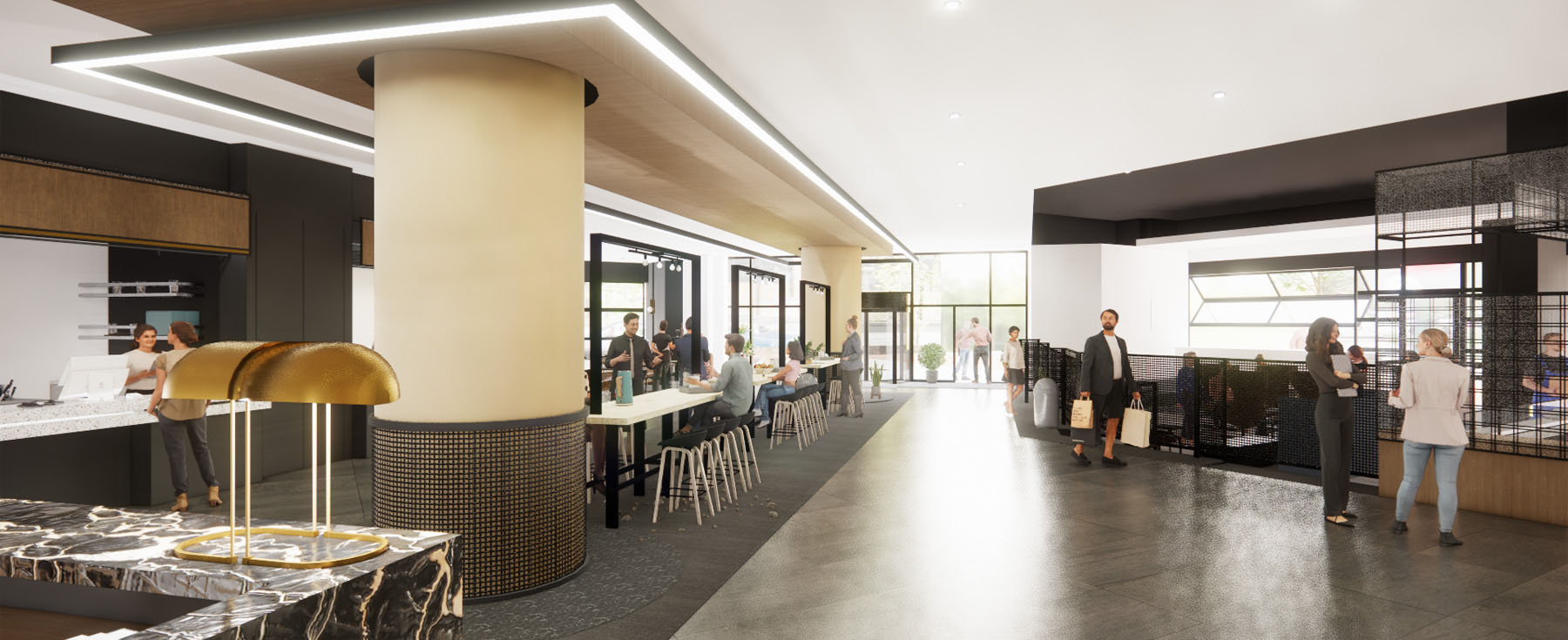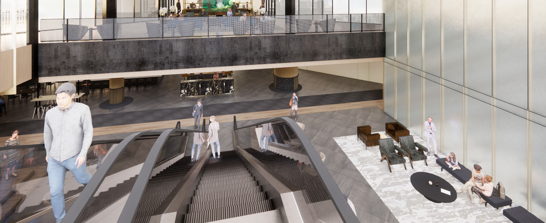 The main floor will be converted into a vibrant food hall after the previous food court and retail spaces lacked the appeal to attract people into the building. Clients will have spaces to work or hold casual meetings with more collaborative seating on the main level. The elevator lobbies will be redeveloped and reclad with the floor near the escalators infilled to create additional soft seating areas.