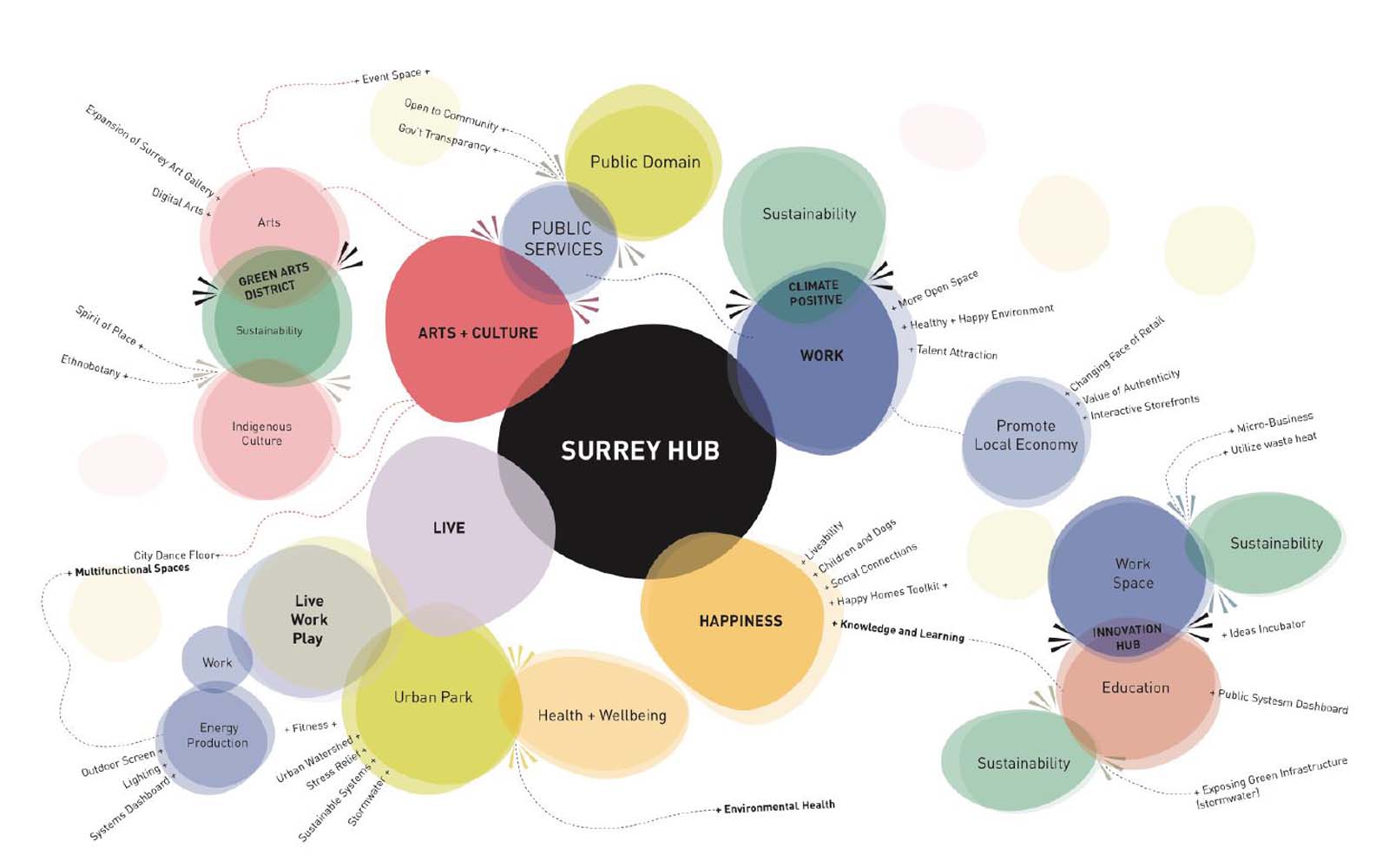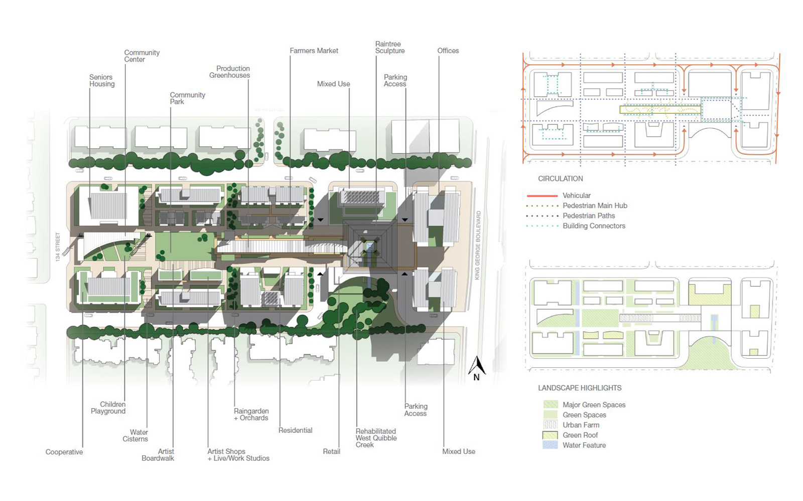 We were engaged by the Government of Canada (PSPC) to complete a Master Plan (2019) followed by a Conceptual Stack and Phasing Plan (2023) for a large land parcel in Surrey, Canada. The project outlines a vision for a happy renewable community. In collaboration with the Surrey Planning Department and industry partners, we identified key drivers to guide site planning including community & culture, housing & density, mobility, natural systems, meaningful partnerships, employment & economy, and energy & resources. In response to the drivers, we developed a series of master plan options ranging from a dense, net zero ready community with opportunities for cultural interaction to a renewable carbon positive community which promotes innovation and lives in harmony with the natural environment.