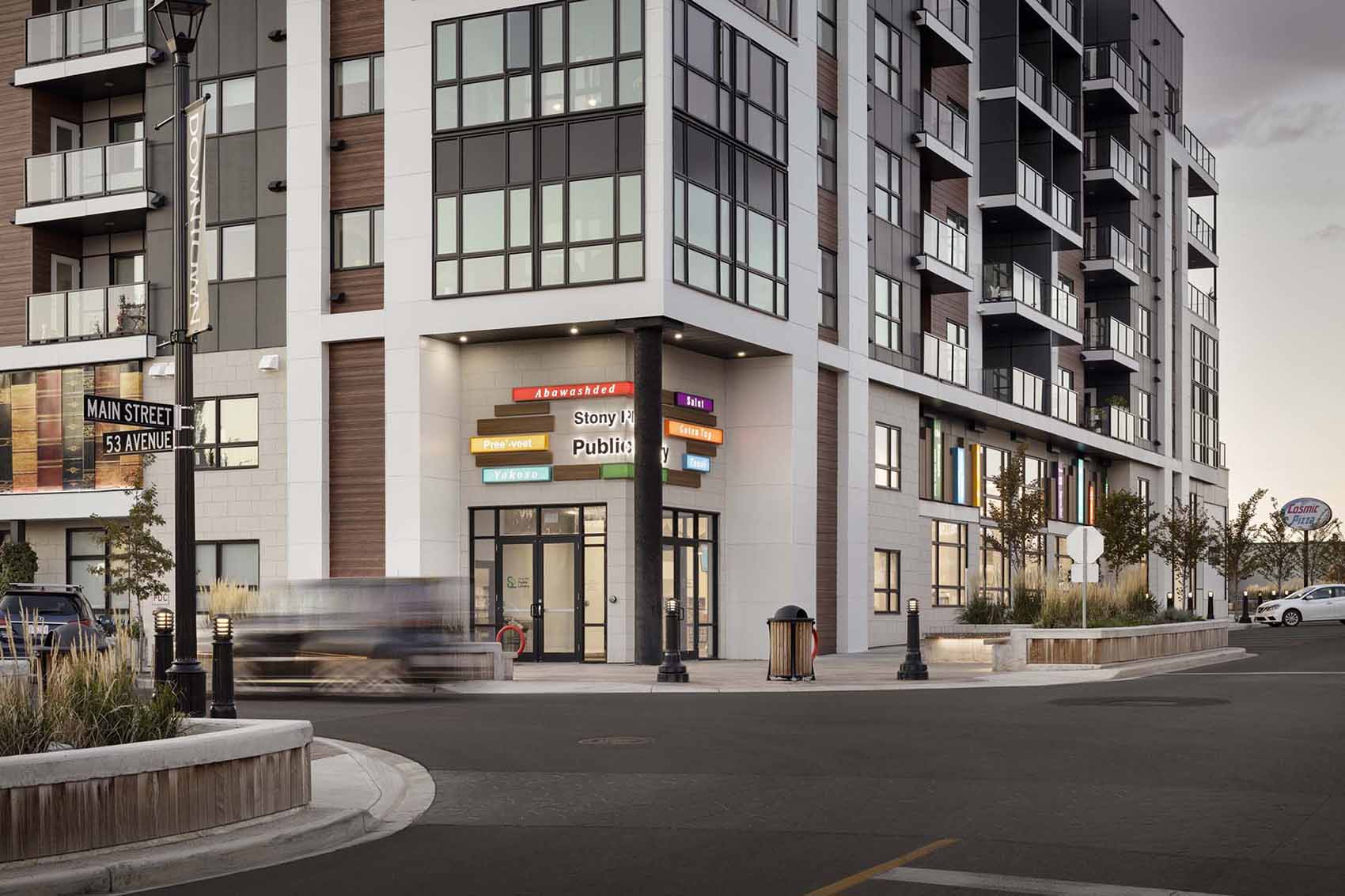 The library now serves as a key gathering place for the people of Stony Plain, while reinforcing the town’s Main Street and preserving cultural history. Users hold events, learn, gather, and reinforce relationships in the new space. There is space for a future mural and café within the overall building development on the main floor.