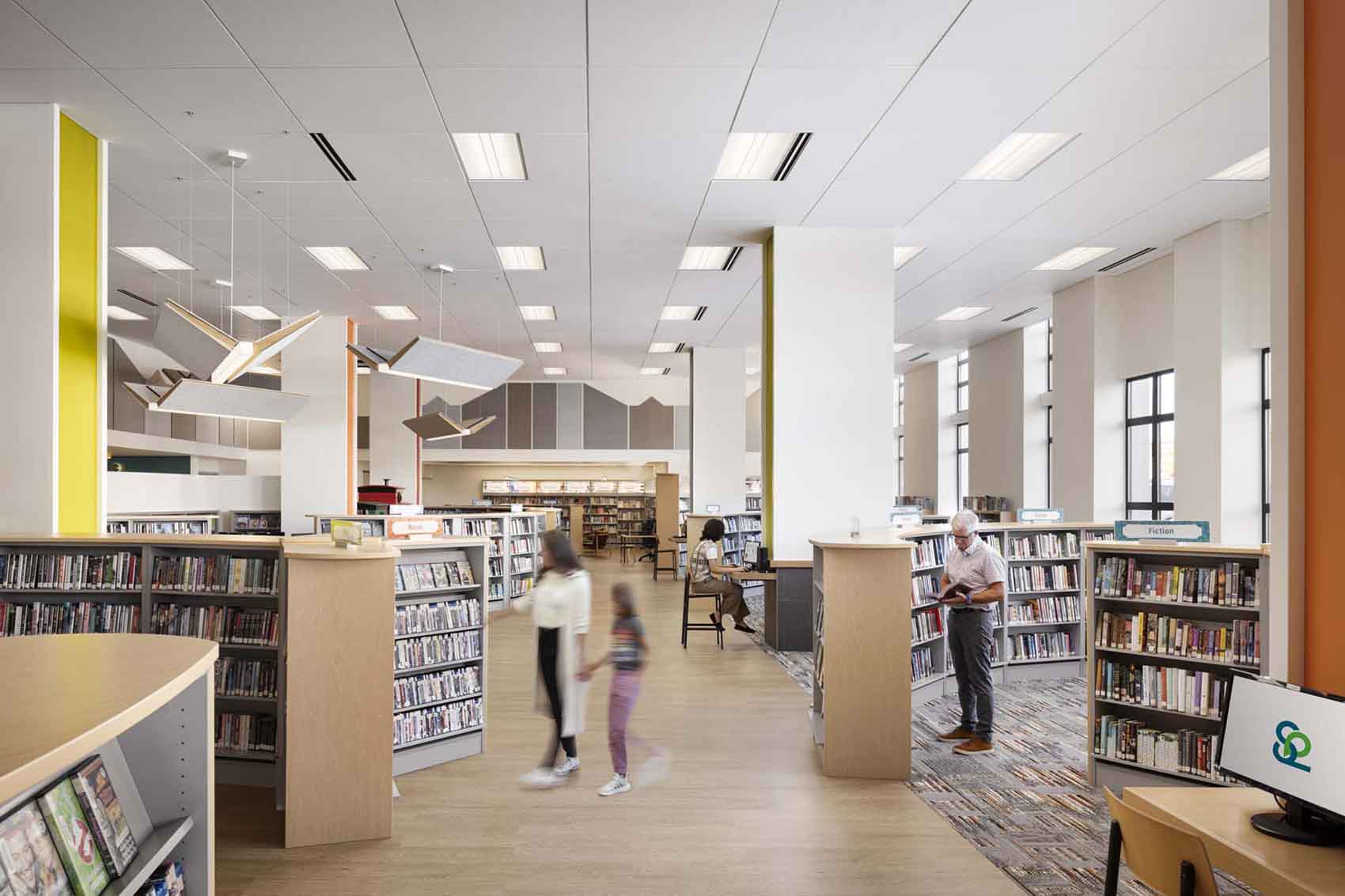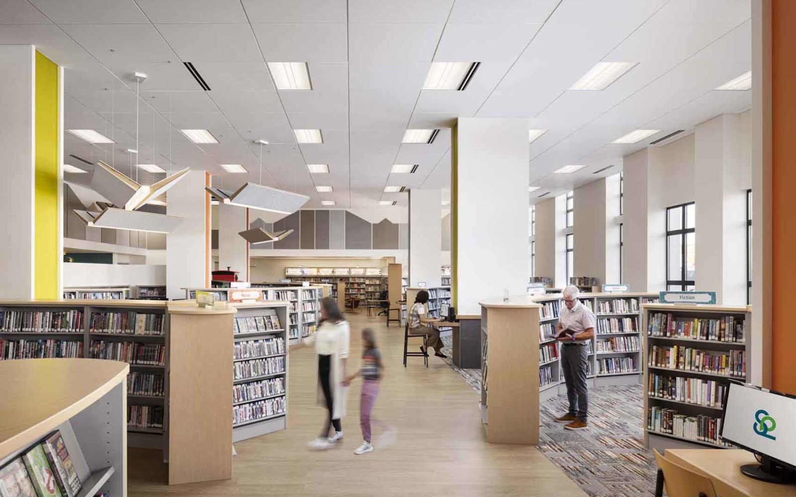 The library staff started visioning the new library’s possibilities well before we were chosen to design. They dreamed of creative cultural programs and well-rounded spaces for children, seniors, technology, and performance. Libraries are no longer the quiet spaces they were in days gone by, and this was an opportunity to modernize this new space with interactive elements.