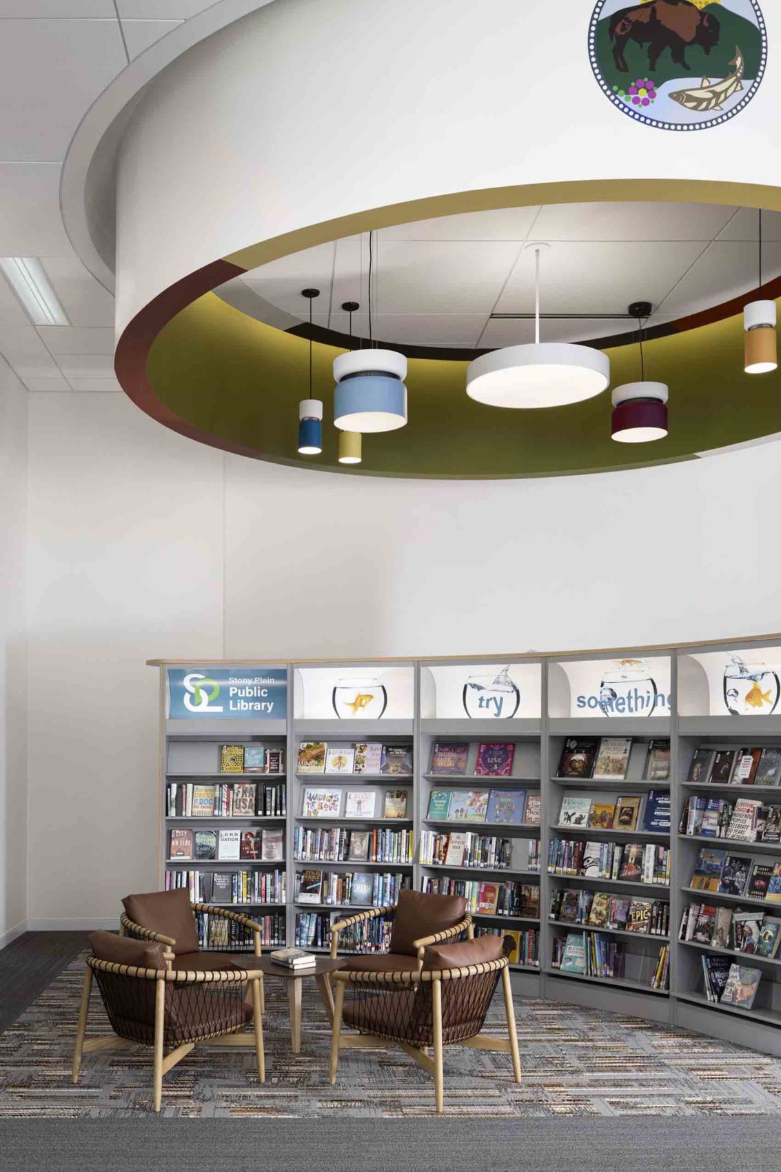 Lights fixtures are shaped like open books, and provide an acoustic treatment to the space, while panels on the upper wall pay homage to Stony Plain’s buildings on Main Street that accent the community. While the outside branding and signage incorporates subtle literary art to draw in users.