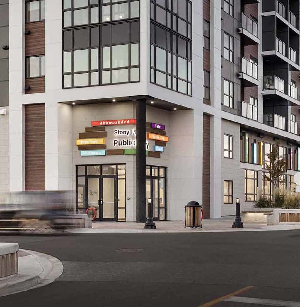 The town’s small library was running out of space, and staff were no longer able to create sufficient community programming to meet growing demand. They needed more room. The town purchased the main floor of a seven-storey mixed-use senior living project on Main Street. With a unique opportunity to integrate the multi-generational facility above, the new library had found a home.