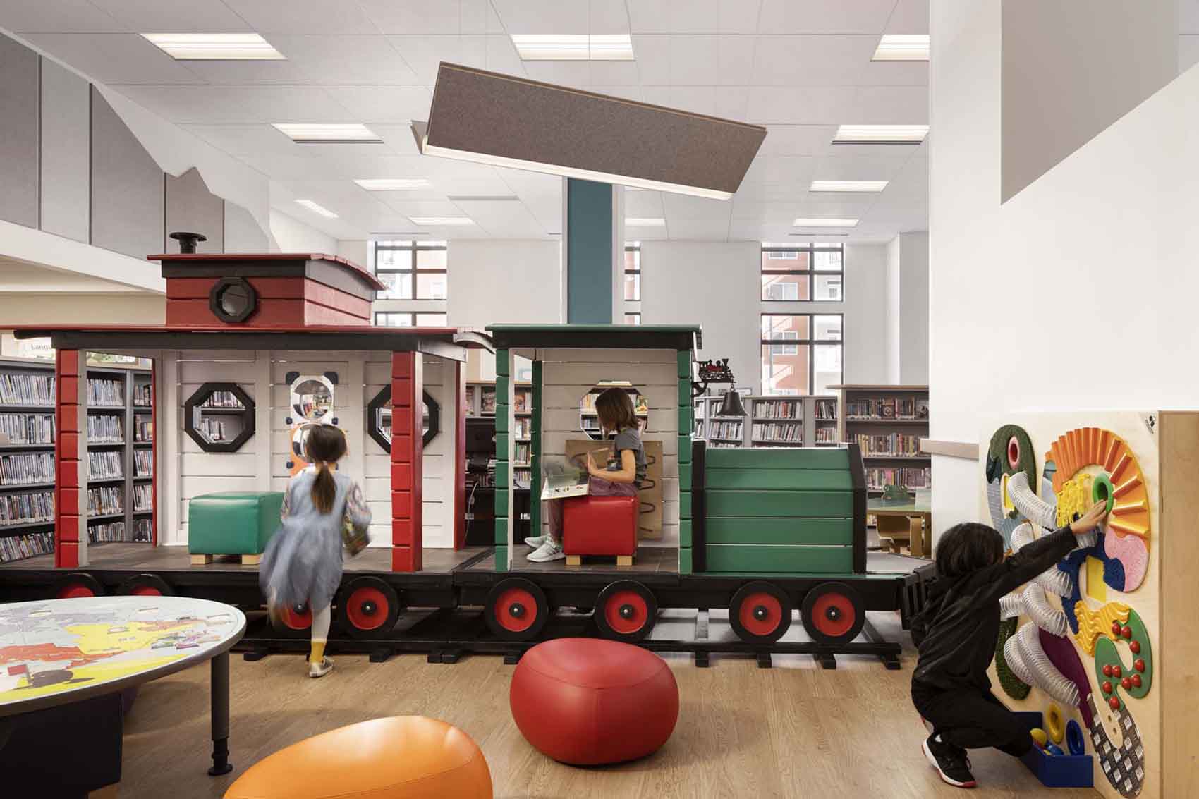 A low ceiling area due to underground parkade access is designed as a cozy nook for children, with large steps and seating to curl up and learn. A wooden train from the old library is one of the key centerpieces of the new space and serves as a reminder of the facility’s history.