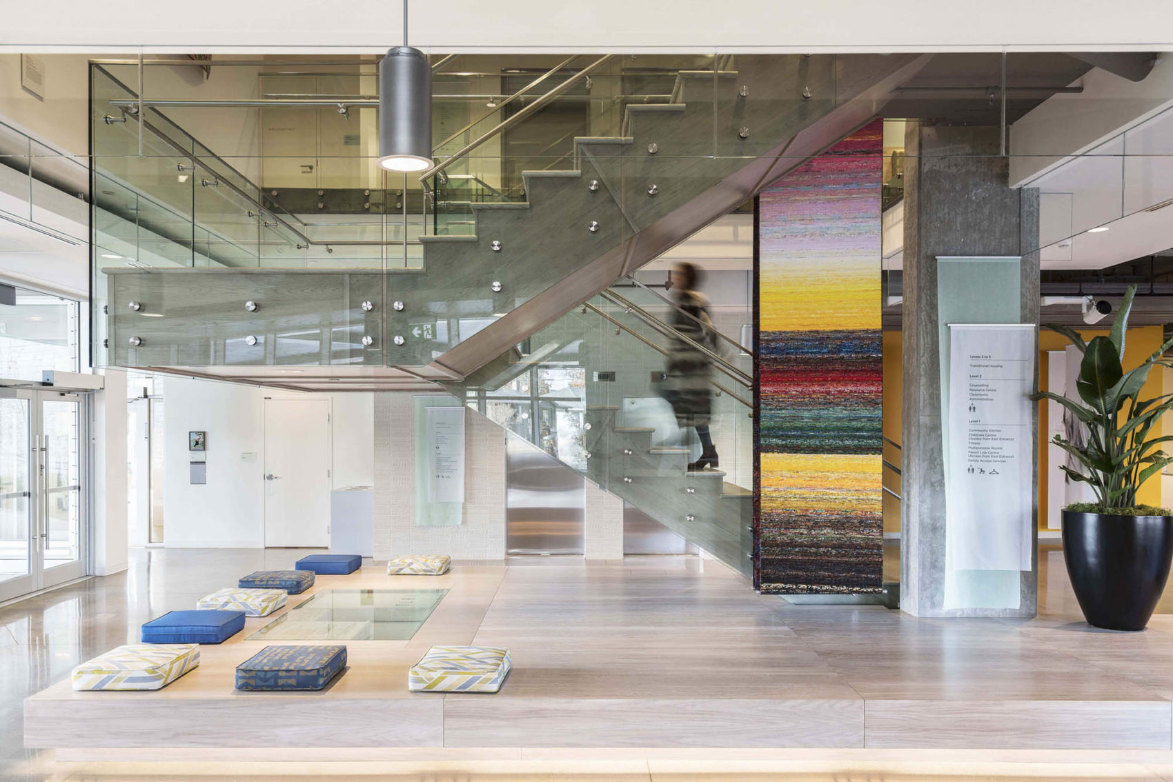 Upon entering the building, you walk amongst empowering canvas portraits that reflect women of all races, religions, ages and walks of life ― mothers, sisters, wives, friends, and daughters. In collaboration with local artists, a comprehensive art program is woven throughout the building and reflects all the women that the YW serve. Amongst a variety of multi-use spaces on the main floor, a large-community kitchen serves as a social centre with a deck that looks toward the front plaza and beyond. Soft seating and flexible furniture allow users to adjust gathering spaces for their needs. Other program includes childcare, administrative, counseling and training spaces, as well as housing for 100 women in need.