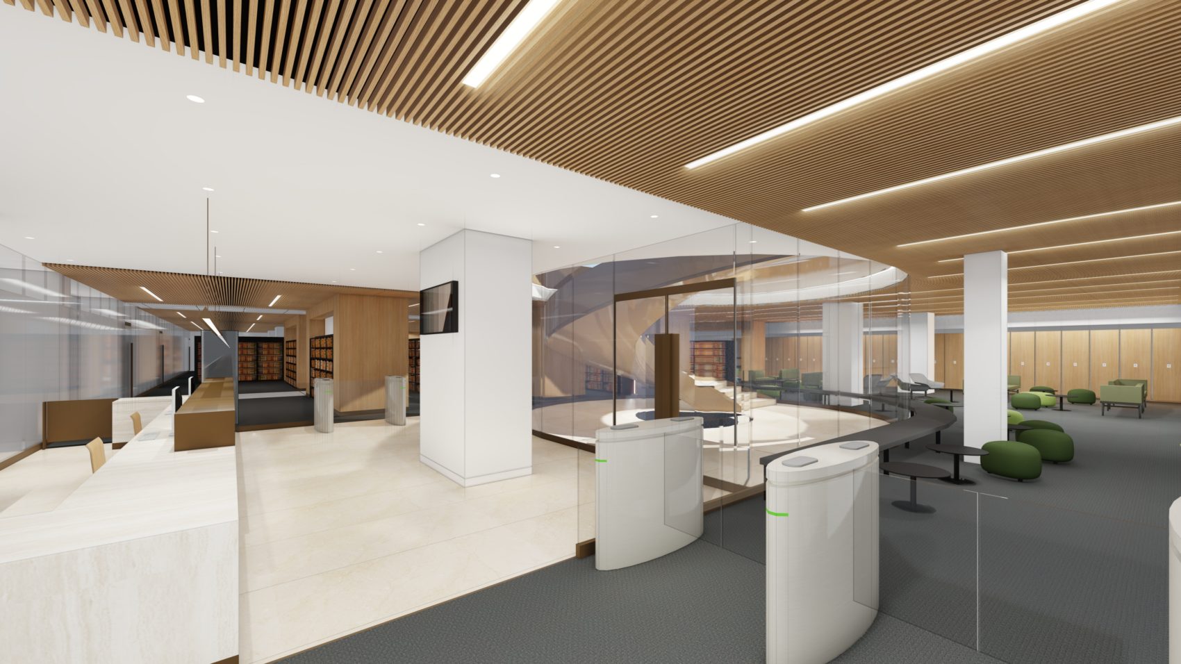 Inspired by I.M. Pei’s iconic addition to the Louvre and emulating the symbolic procession from the Grand Hall to the Supreme Court that defines the permanent Supreme Court building, the spiral staircase and circular glass elevator enshrines the Supreme Court as Canada’s preeminent courthouse placed strategically above Federal Courts located on the first floor and accessed directly from the Grand Hall. Ascending from the Grand Hall, the staircase gently curves 360 degrees landing at a bronze-clad portal that frames the Supreme Court entrance. Descending from the Grand Hall, the staircase again curves 360 degrees to land at the entry to the Supreme Court Library which is geared to meet the immediate information needs of the courts.
