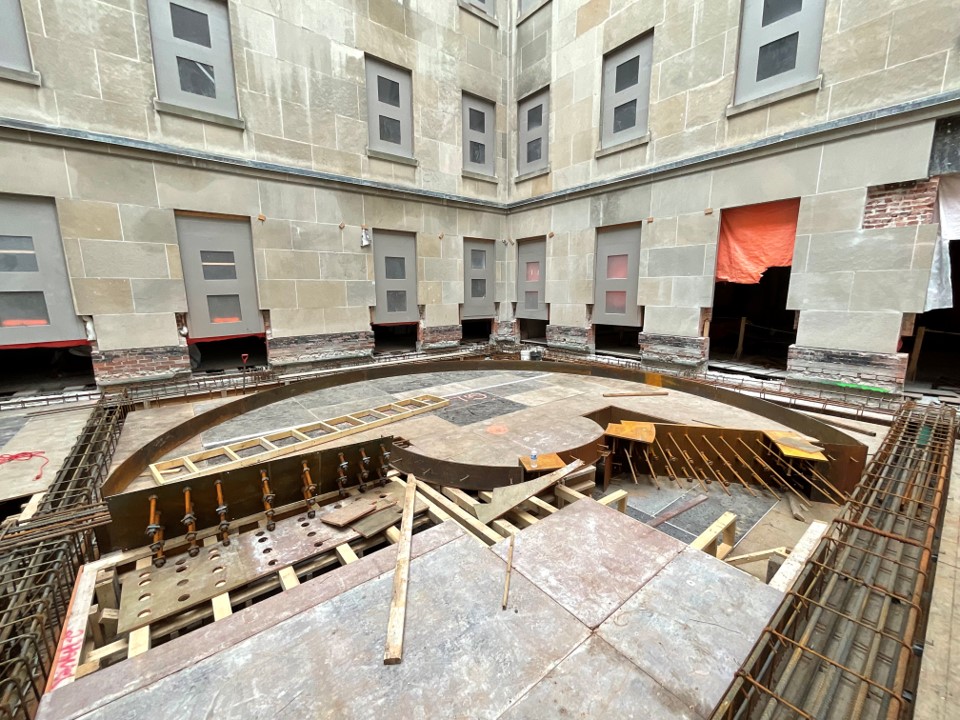 Constructed of structural curving glass and steel, and clad in bronze, the spiral staircase and glass elevator is also designed to support Grand Hall functions and events. The sweeping curve of the staircase offers panoramic perspectives of the Grand Hall overlooking events and functions that are regularly scheduled within this prestigious, historic space, which was originally an exterior lightwell.