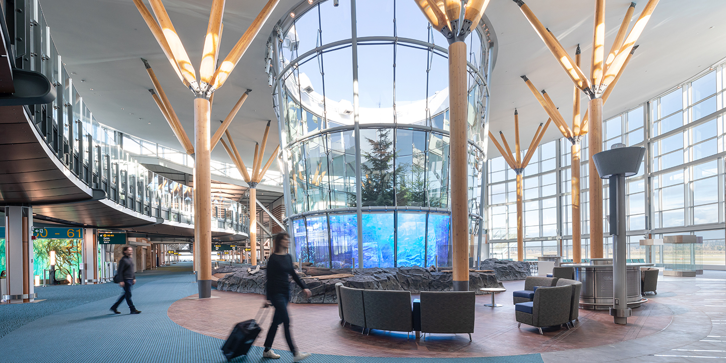 The YVR Pier D expansion design pays tribute to the natural beauty of British Columbia, welcoming travelers to experience this splendor through immersive experiences incorporated into the grand rotunda space including an accessible open-air garden atrium with large Western Hemlock trees, water features and digital experience elements.